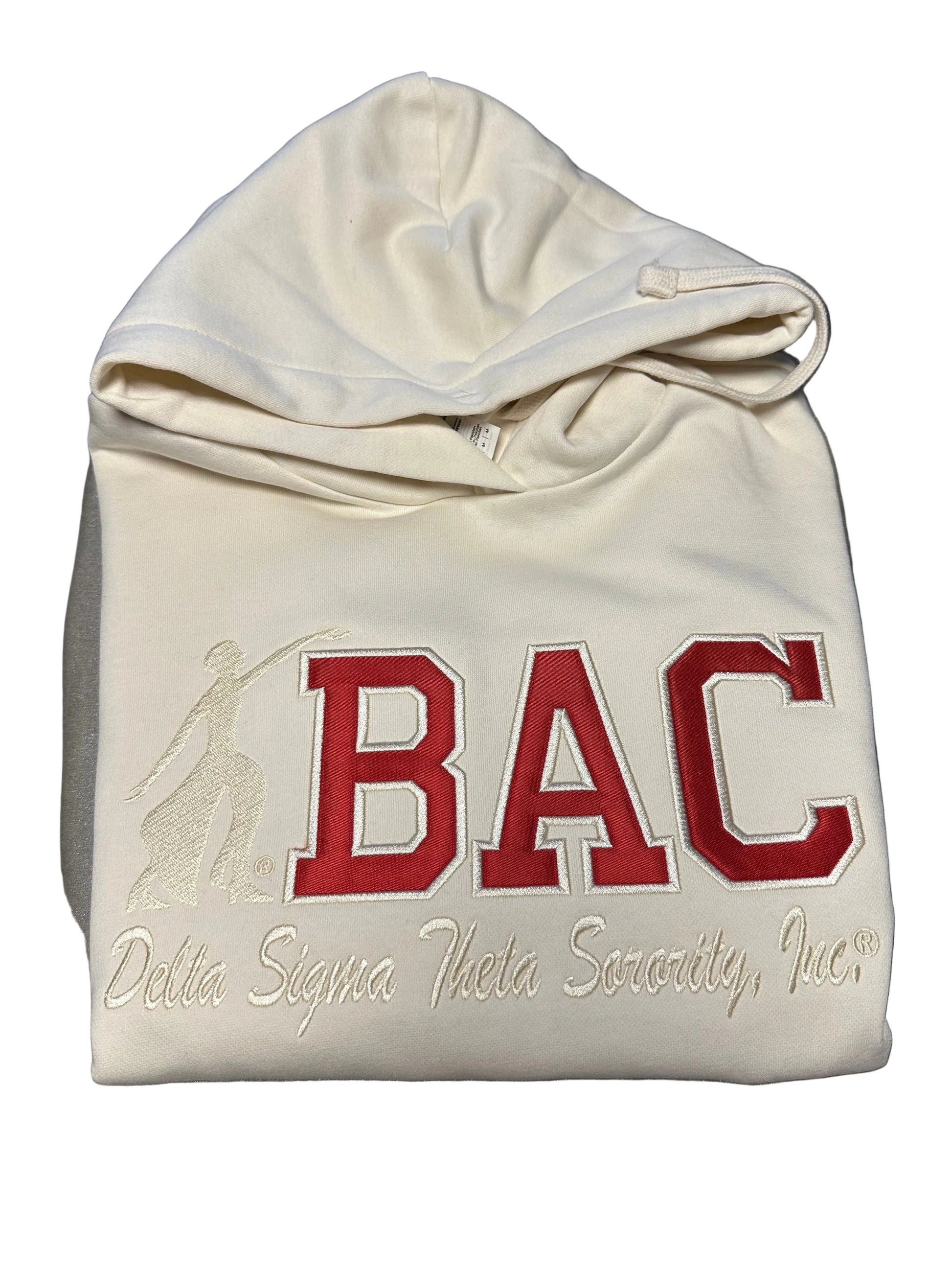 This premium women's fleece hooded modest crop sweatshirt features your chapter of affiliation in red with a Lady of Fortitude. Featuring raised embroidery highlighting the red chapter letters and the sorority name spelled out. Expertly crafted with contemporary style, it provides a refined way to honor sisterhood. The side seams and ribbed knit cuffs and hem give it enhanced durability. The modest crop comes to the top of waistline for most. Available in monochrome black on black and cream on cream with red chapter letters. Shown is Baltimore Alumnae