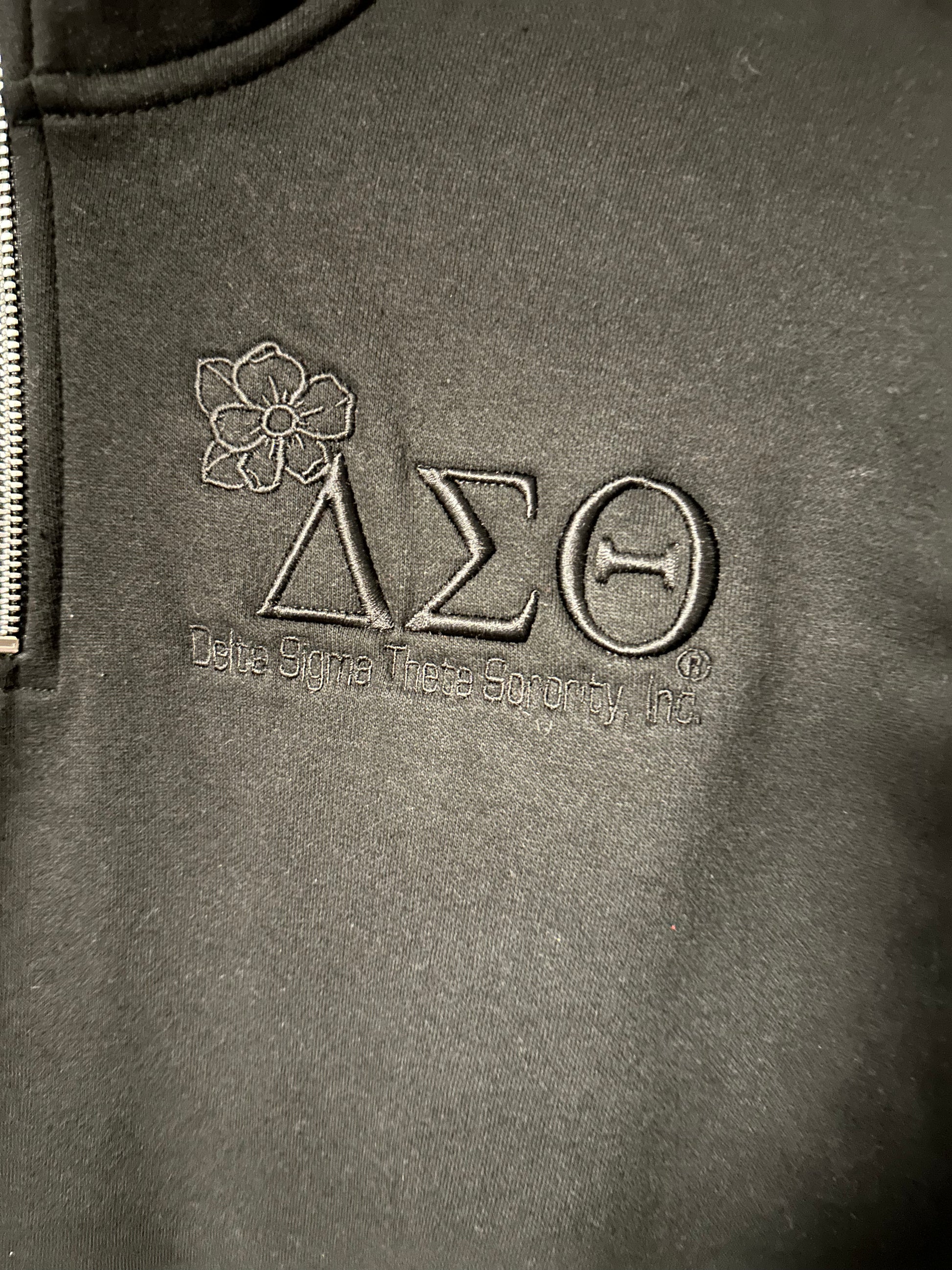 Elevate your wardrobe with the DST 1/2 zip monochrome embroidered pullover, crafted from ultra-soft fleece for exceptional comfort at great value. It is expertly embroidered with Greek letters DST, the full DST name, and the signature violet, blending style with meaningful detail. It features relaxed drop shoulders and a modest cropped length, this piece offers a modern silhouette with side seams for added structure. Finished with durable 1x1 rib knit cuffs and hem, this pullover is designed for lasting wear and effortless layering.